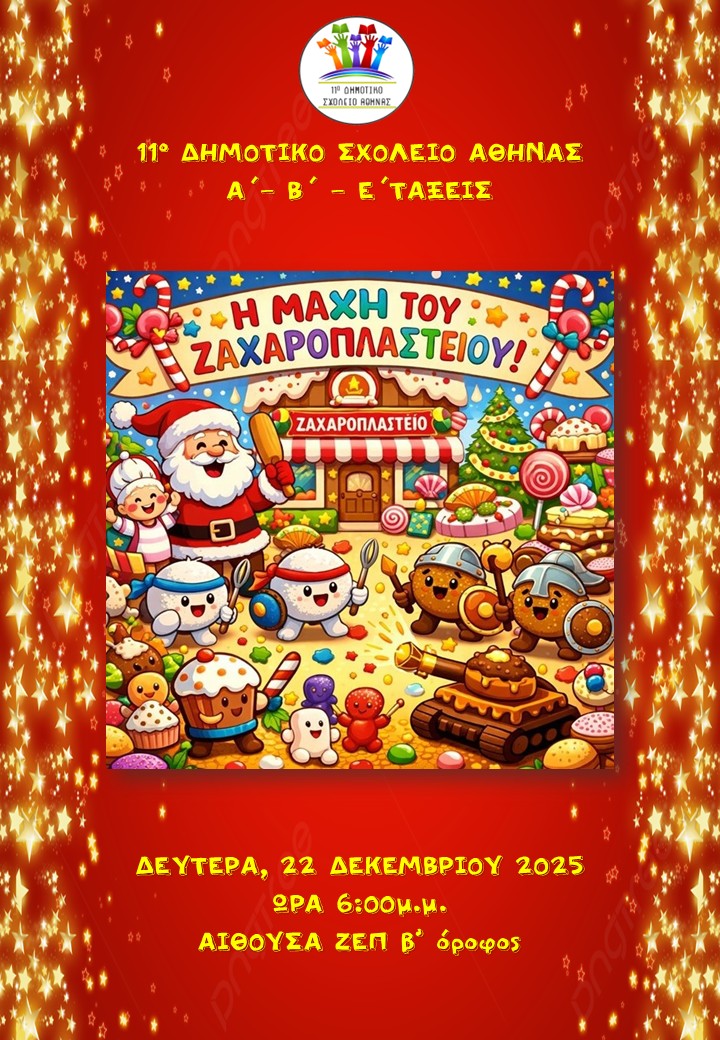 Σας προσκαλούμε την Δευτέρα, 22 Δεκεμβρίου 2025 και ώρα 6:00μμ στην αίθουσα ΖΕΠ θα πραγματοποιηθεί η Χριστουγεννιάτική εκδήλωση των Α, Β και Ε τάξεων!!!